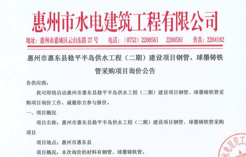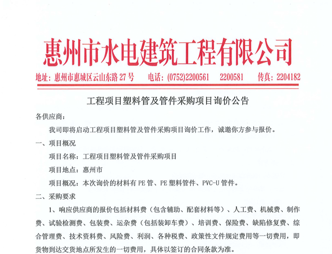 惠州市水電建筑工程有限公司成立于一九六四年四月,隸屬惠州市水務(wù)集團(tuán)有限公司,是一家國有綜合性施工企業(yè),主營水利水電工程、房屋建筑、市政工程等施工業(yè)務(wù)。公司擁有水利水電工程施工總承包一級(jí)、建筑工程施工總承包一級(jí)、市政公用工程施工總承包一級(jí)、公路工程施工總承包三級(jí),公路路基、路面及建筑裝修裝飾專業(yè)承包二級(jí),環(huán)保工程、機(jī)電安裝、河湖整治、輸變電工程專業(yè)承包三級(jí)等經(jīng)營資質(zhì)……